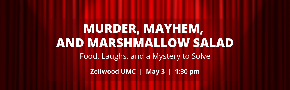 Purchase your tickets below for Murder, Mayhem, and Marshmallow Salad on Saturday, May 3 at 1:30 pm. Tickets are $20 per person and include a meal. Once purchased, your tickets will be held under the name of the purchaser and can be checked in at the door when you arrive. We look forward to a fun afternoon of laughter, mystery, and community together.